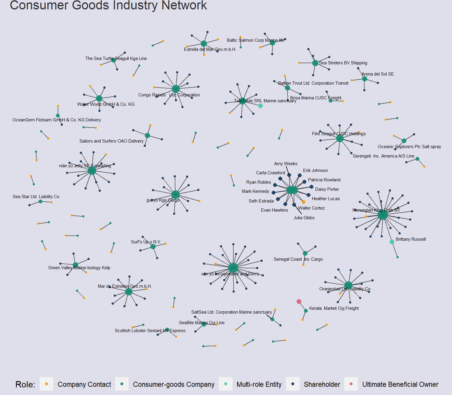 FishEye International, a non-profit focused on countering illegal, unreported, and unregulated (IUU) fishing, has been given access to an international finance corporation’s database on fishing related companies. In the past, FishEye has determined that companies with anomalous structures are far more likely to be involved in IUU (or other fishy business). FishEye has transformed the database into a knowledge graph, including information about companies, owners, workers, and financial status. FishEye is aiming to use this graph to identify anomalies that could indicate if a company is involved in IUU.