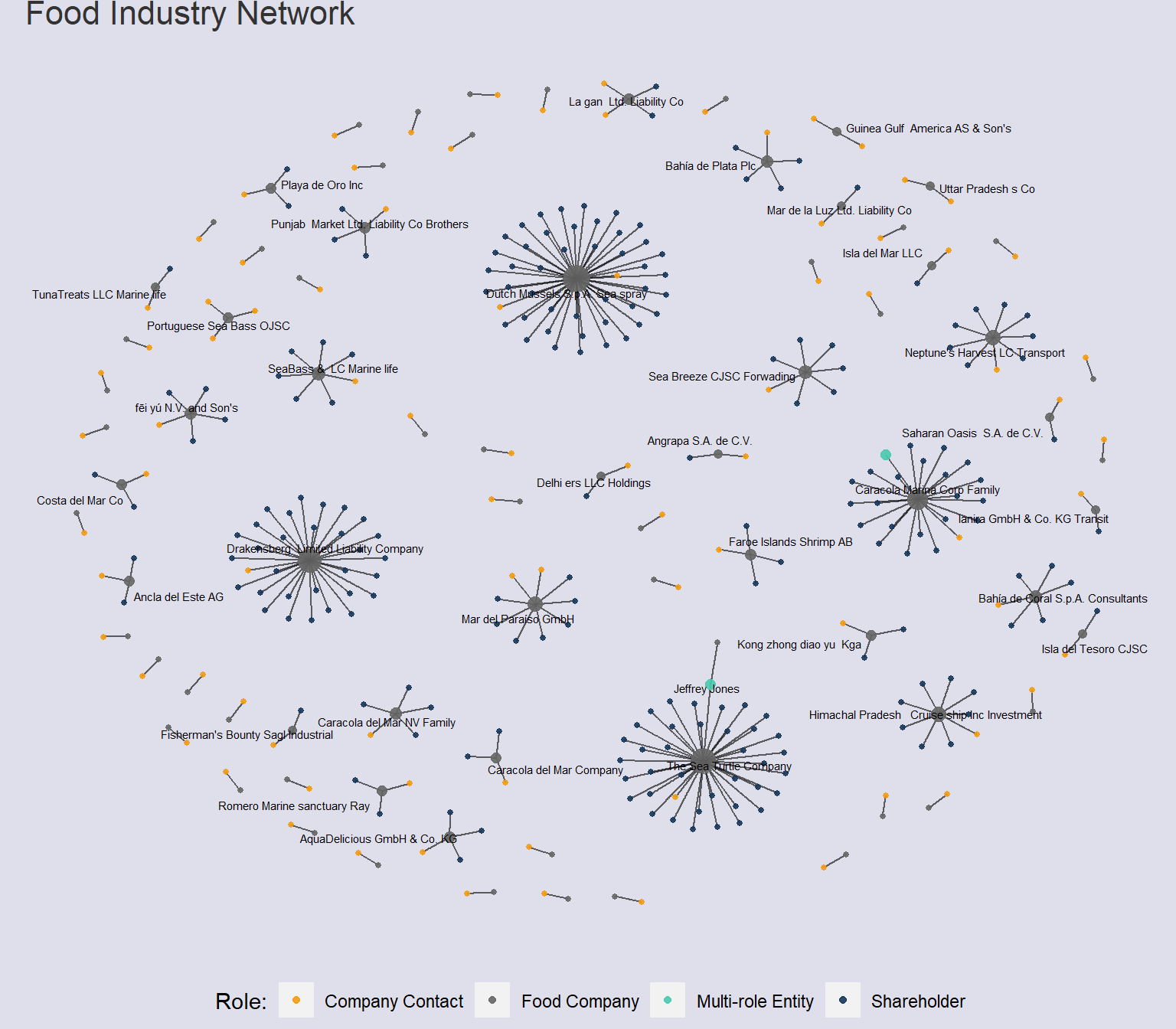 Many of the ‘groups’ of companies by industry had high jaccard similarity and Orbit Distribution scores, which suggests that there is a significant overlap in the connections and relationships between companies, owners, and contacts involved in the overall network between industries. These network diagrams are visualised to compare the graphlet structures within the expanded networks, to determine if there are fishy ties between entities across industries.